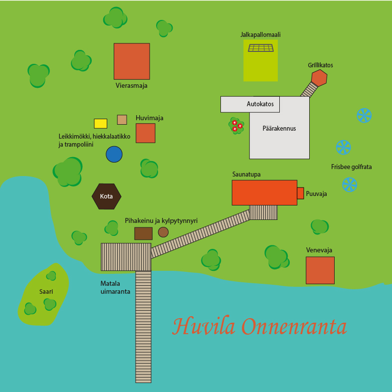 trampoliini, leikkimökki, frisbee golfrata (3 koria), jalkapallomaali, hiekkalaatikko ja pelejä. Rantavedestä löytyy myös lautta.